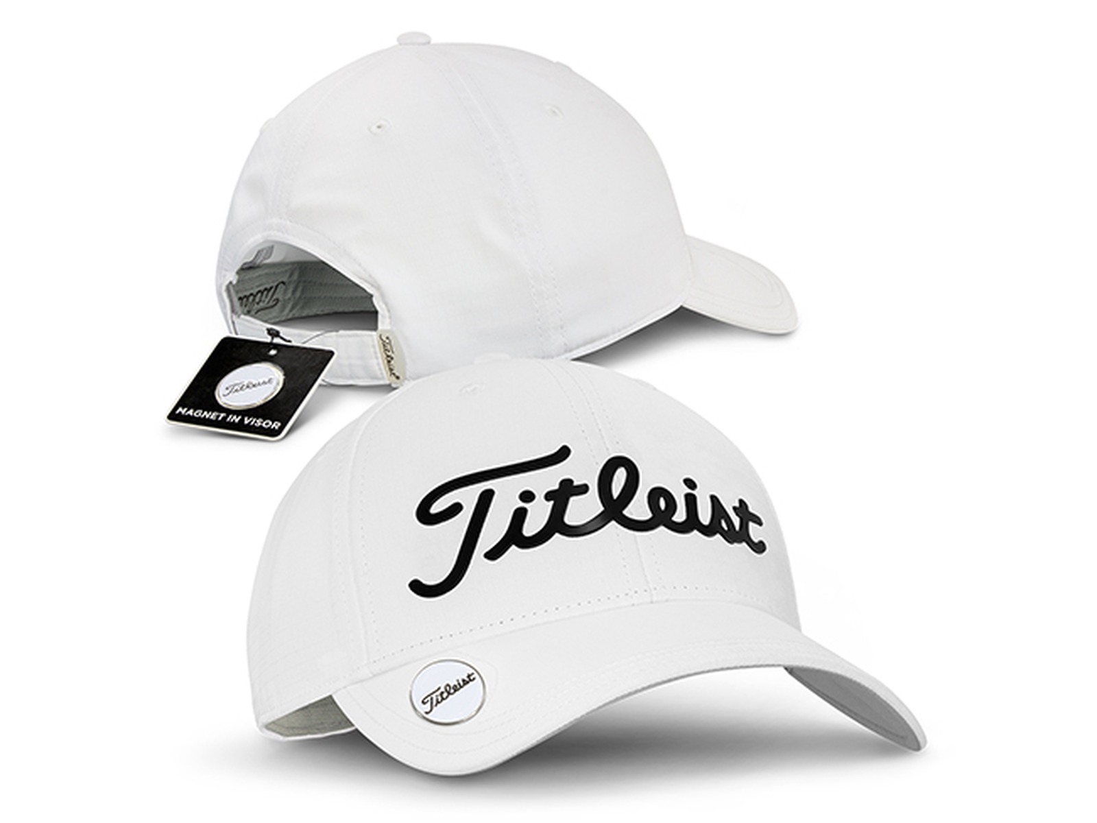The Titleist Performance Ball Marker Cap offers style and functionality that lives up to the brand’s reputation for driving excellence on the golf course. This outstanding six-panel cap is manufactured from Titleist’s proprietary moisture-wicking performance material which is legendary for its odour-reducing properties, anti-microbial technology and UV sun protection. A conveniently placed magnet in the pre-curved peak holds a metal Titleist branded ball marker for easy access on the green. Other features include embroidered eyelets for improved airflow, an absorbent sweatband and an adjustable Velcro closure so one size fits most people. The Titleist logo is boldly branded on the front.