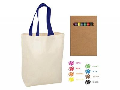 Ideal for holding A4 sized documents, books and catalogues, these bags make a fun way for kids as well as adults to use their creativity while colouring and decorating these promotional cotton bags on their own. It keeps kids entertained for hours and keep them away from electronic devices at the same time. Our bags are made of 140gsm eco friendly 100% unbleached natural cotton fabric and feature a gusset and coloured webbing handles. They will also be supplied with 8 assorted non toxic coloured wax crayons packed in a recycled cardboard box, which will be packed in a small plastic bag stapled on each trade show bag.