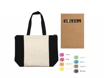 Ideal for any kind of shopping trip, these bags make a fun way for kids and adults to use their creativity while colouring and decorating these promotional cotton bags on their own. It keeps kids entertained for hours and keep them away from electronic devices at the same time. Our bags are made of 305gsm 100% quality cotton fabric and feature coloured sides and a black zip closure as well as a gusset and black webbing shoulder handles. They will also be supplied with 8 assorted non toxic coloured wax crayons packed in a recycled cardboard box, which will be packed in a small plastic bag stapled on each trade show bag.