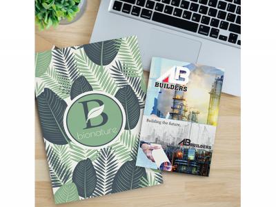 These custom notebooks have a 350gsm cardboard front cover which can be branded with stunning edge-to-edge full colour print on the front and back.
