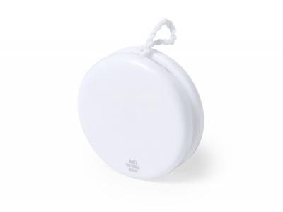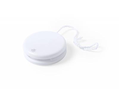 These custom printed and antibacterial treated yo yos feature a solid white finish and come with a 100 cm long and matching colored cotton cord.