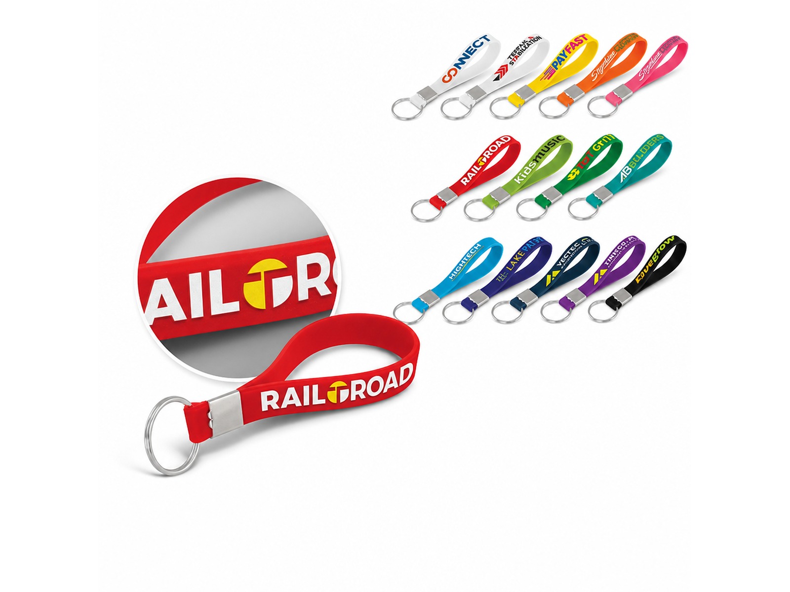 Personalize your silicone strap key tags - embossed or custom design rubber keyrings for your marketing campaign.