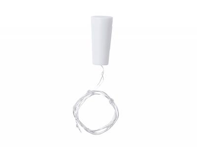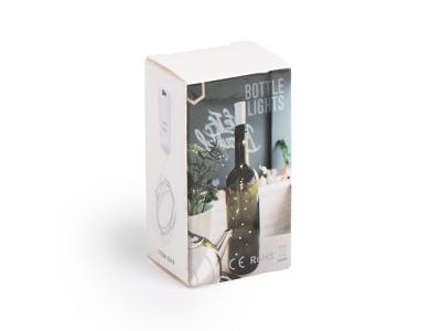 The cable includes 10 LED lights in white color and will turn any empty bottle into a highlight. They are battery powered (button cell included) and have an ON/OFF button. These promotional string lights will be presented in an attractive designed box.