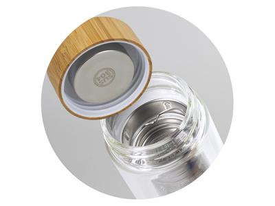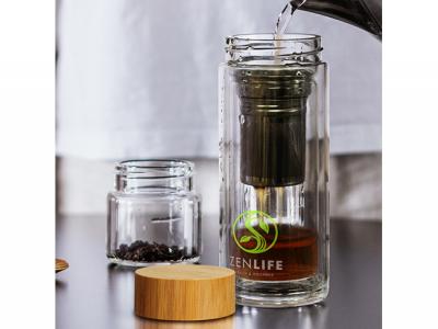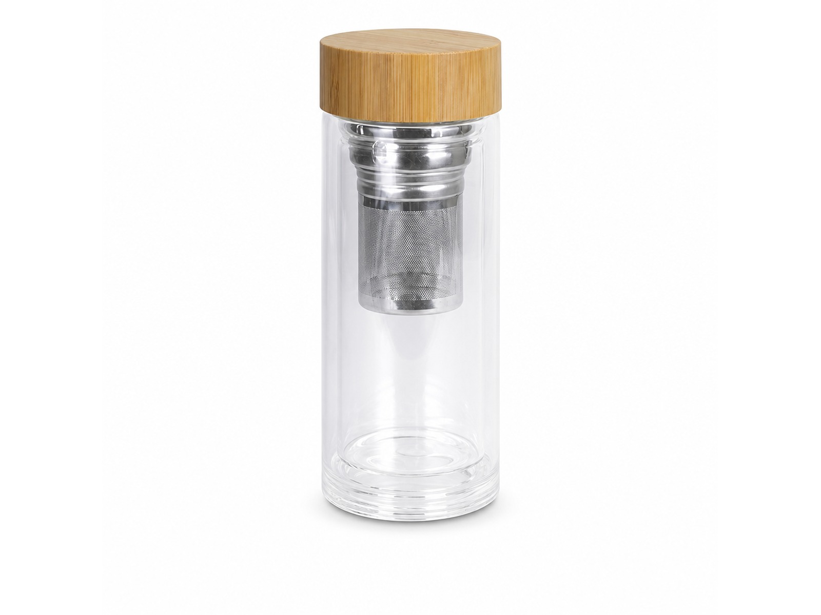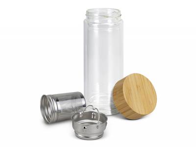 These custom printed elegant 350ml, double-wall borosilicate glass bottles maintain hot or cold drink temperatures for longer and remain comfortable to hold. They have a removable stainless steel infuser for tea or fruit and a secure screw on bamboo lid.
