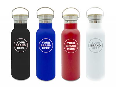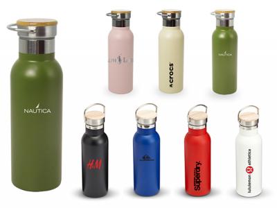 These custom branded 500ml water bottles are made of double-walled stainless steel and are vacuum insulated for maximum temperature control. They also feature a convenient twist off wooden cap as well as a carry handle.