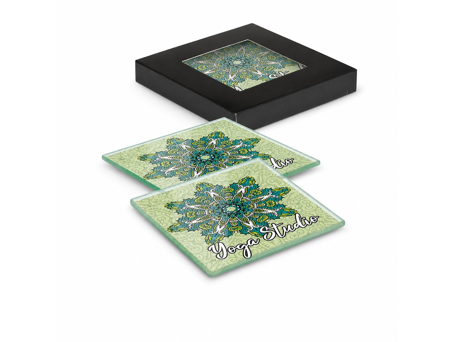 These custom printed sets of two square glass coasters come nicely presented in a stylish black gift box with a window to show off the brand. The coasters have four soft non-skid, non-marking polyurethane pads on the base.