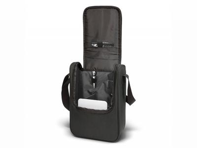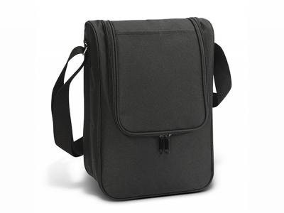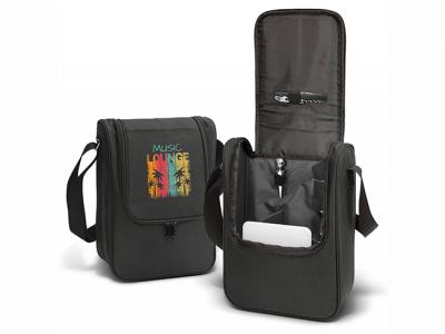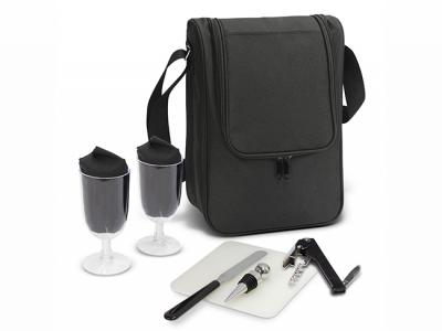 The bags are manufactured from strong 600D polyester with an easy-clean lining. These custom picnic sets have a large zippered main compartment, an internal slip pocket, an external slip pocket and an adjustable woven shoulder strap with silver metal buckles. These custom picnic sets also include two acrylic glasses, two black cotton napkins, a bottle opener, a wine stopper, a cheese board and room for two bottles of wine with a padded divider.
