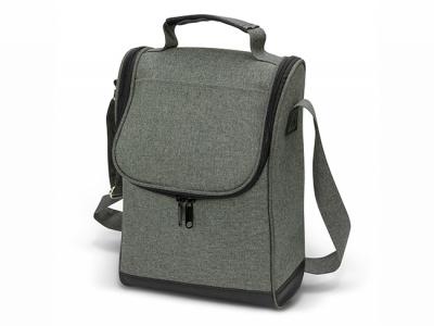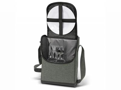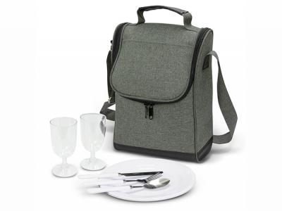 These exceptional two-person custom picnic sets are made from strong 600D poly-canvas with a trendy two-tone heather finish. These handy custom picnic bags come with a large zippered main compartment, a large front slip pocket, a carry handle with a PU cuff and an adjustable shoulder strap with silver metal buckles. These custom picnic sets also include two acrylic glasses, two knives, forks and spoons, two plates and two elastic loops to secure a bottle of wine.