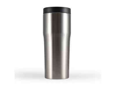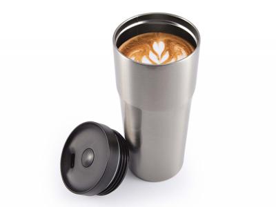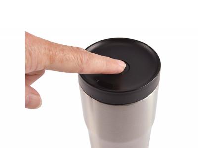 These custom branded double walled, stainless steel vacuum cups have an unique push button open/close mechanism in the lid and will keep drinks hot or cold for hours! The perfect coffee cup for the daily commute to the office.