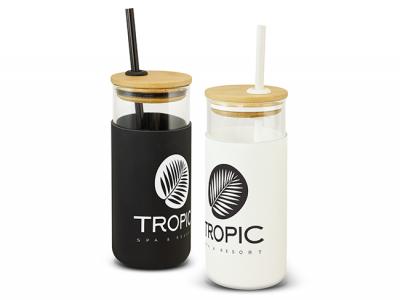 Sip in style and sustainability with our Glass Tumblers. They're more than tumblers; they're your brand's eco-conscious sip of success. These stunning custom glass tumblers are manufactured from lightweight borosilicate glass which is exceptionally strong and shatter-resistant. They feature a secure push-on natural bamboo lid with a stainless steel or silicone straw and a matching silicone seal. These customised glass tumblers have a non-slip protective silicone sleeve that prevents condensation and keeps drinks cool for longer.