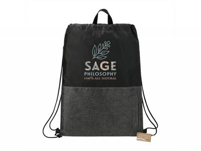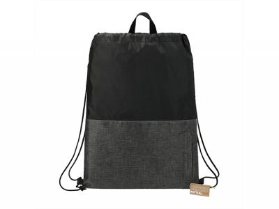 These custom printed recycled drawstring bags feature a cinch closure with a vertical zippered front pocket. They are eco friendly and made from recycled water bottles.