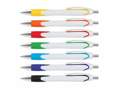 These retractable plastic ballpoint printed pens feature a stunning contoured barrel, a design inspired soft rubber grip and shiny chrome trim. These custom pens have a blue large volume refill with 1800 metres of German manufactured Dokumental ink and a tungsten carbide ball for improved writing quality.