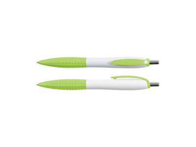 These push button ballpoint pens come with black ink and feature a white barrel with chrome button. The highlights are their matching coloured clips and dimple grips.