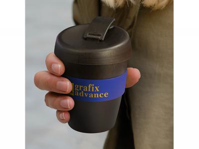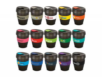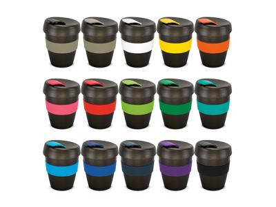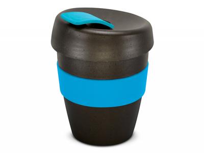 These design inspired 350ml reusable custom cups have an incredible story to tell: They are manufactured from a 50/50 blend of coffee grind and BPA-free polypropylene and feature a heat-resistant silicone band and a secure screw on lid with a splashproof flip closure. The flip closure and band can be mixed and matched in any colour combination from the standard colours. Up to five different colour combinations are included in the price and more are available for an additional charge.