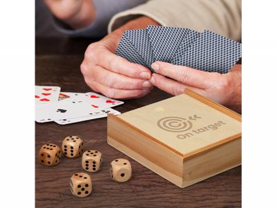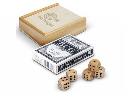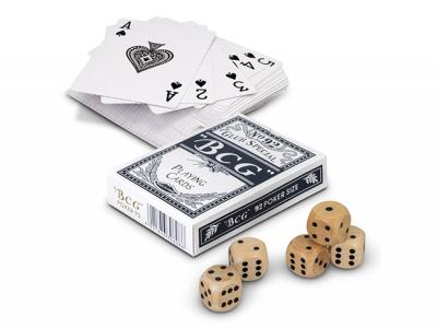 Provide hours of fun with these custom branded boxes of playing cards and dice! These promotional card game sets include a 52 Deck Pack of Cards and five dice.