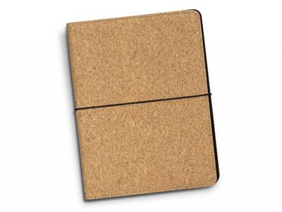 Promotional A5 Portfolios manufactured from cork with an elastic PU strap for secure closure. Includes a lined paper pad, a pen holder, five business card slots, a pocket for notes and a slip side pocket for documents. Packed in an unbleached kraft cardboard sleeve.