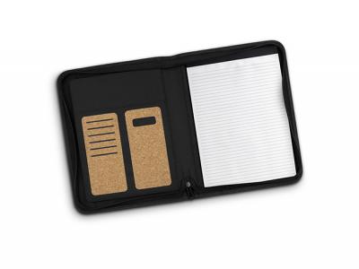 Promotional A4 Portfolios manufactured from cork with a zippered closure. Include a lined paper pad, a pen holder, six business card slots, a pocket for notes, and a large slip-side pocket for documents. Packed in an unbleached kraft cardboard sleeve.