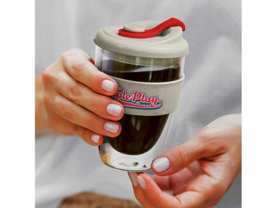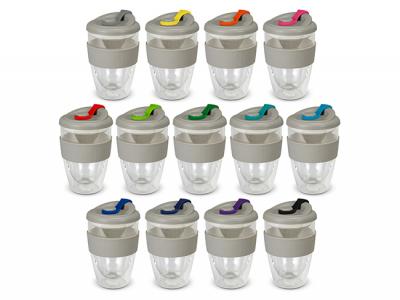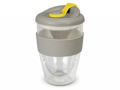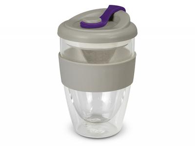These exquisite 350ml double wall borosilicate glass cups feature a secure push-on polypropylene lid with silicone swivel closure and a wide heat-resistant silicone band.