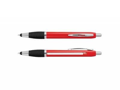These retractable plastic ball pens feature a soft rubber grip, a shiny chrome trim and a stylus for use with touch screens. They have a unique spring-loaded, pull-out advertising banner which can be branded in full colour on both sides.
