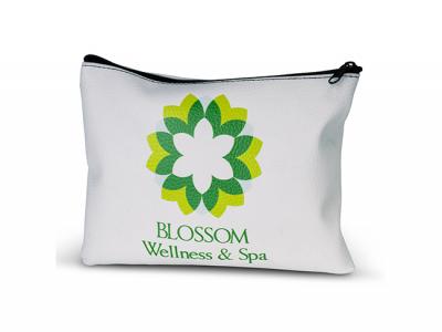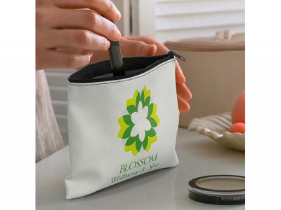 These small cosmetic bags are manufactured from leather look PU and will be branded in full colour on both sides with no extra cost. These promotional pouches also feature a black zipper and black stitching that matches the zip colour.