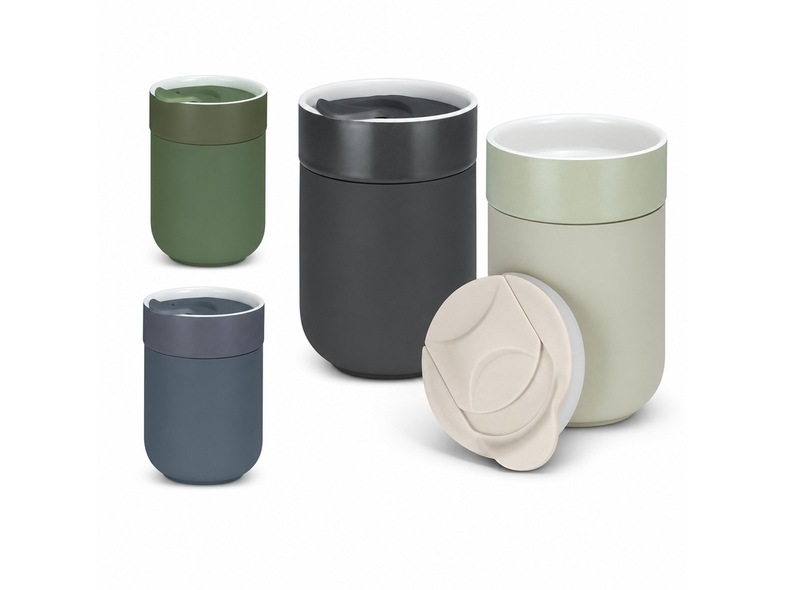 These contemporary eco friendly 300ml reusable ceramic coffee cups have a heat-resistant silicone casing and a slide-closure lid insert that can be easily taken in and out.