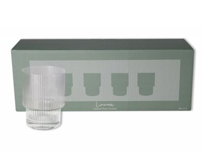 Add a touch of classic charm to your next dinner party with the Custom Glass Tumbler, exuding a vintage sophistication. These custom glass tumblers, crafted from fluted glass, are guaranteed to impress your dinner guests. Please keep in mind that as these glasses are handmade, there may be minor variations and imperfections among them. Sold in sets of four, these Ribbed Glass Tumblers are an excellent choice for corporate gifts and gift baskets.