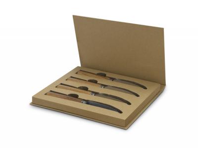 This set of four steak knives boasts a premium design, featuring durable Acacia wooden handles and sharp stainless steel blades. The knives are presented in a natural gift box with a branded black sleeve, making for an elegant and sophisticated gift.