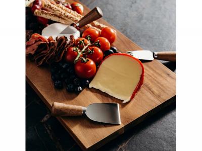 This functional set includes four cheese knives and utensils, each with a unique shape and size. The knives are fitted with durable Acacia wooden handles and sturdy stainless-steel blades. The cheese knife set is presented in a natural gift box with a branded black sleeve, making it an excellent gift for any cheese lover.