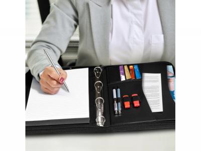 A portfolio designed for professional use that is made from PU material and comes with metal ring binders that can be removed. The portfolio is equipped with a zippered closure to ensure security and convenience. It also contains internal loops to hold pens and flash drives, as well as large document slips and three business card holders.