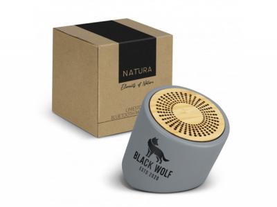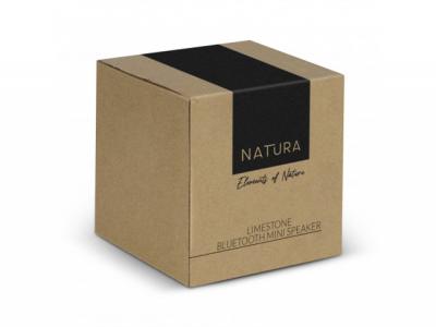This is a chic 3W Bluetooth speaker that features a limestone casing and a natural bamboo grill. It has a 500mAh battery that provides up to 3 hours of playtime and recharges in just 2.5 hours. You can easily control the music with the pause and play controls located on the base of the speaker. The speaker comes packaged in eco-friendly kraft packaging, branded with Natura, and includes a Micro-B USB cable and instructions.