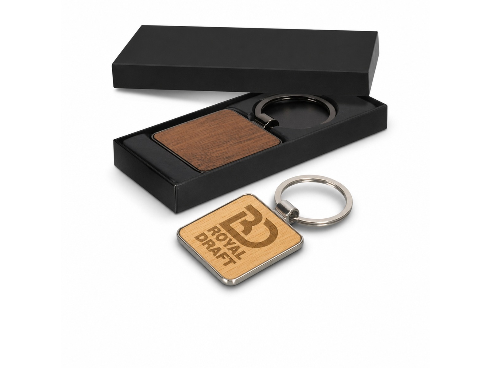 This durable keychain features a square-shaped shiny nickel or gunmetal key ring attached to a beach wood or sapele wood branding area. It comes presented in an individual black box, making it a sophisticated and stylish gift option. With its combination of durability, premium materials, and sleek design, this keychain is not only functional but also makes a statement.