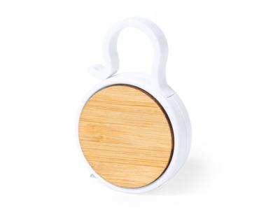 This flexible measuring tape is 1 meter long and made of tough, white ABS material. It has a bamboo insert on the body and a transport ring for convenience. The blade is marked with both centimeter and inch measurements, and the tape also has a wide surface area for branding.