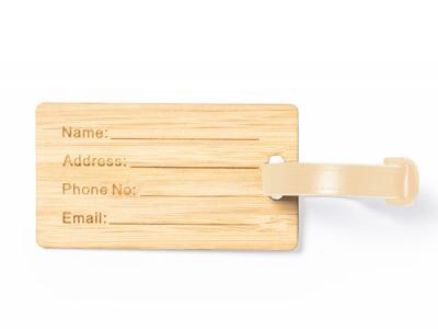 This luggage tag is made of bamboo and features a strap with a metal buckle closure. ID data in English on one side, and the opposite side is blank, making it a great option for branding purposes.