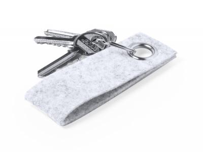 This keyring has an elegant design and features a strap made of felt RPET material, which promotes sustainability by utilizing recycled plastic waste. The strap has a chromed metal eyelet that adds to its aesthetic appeal.