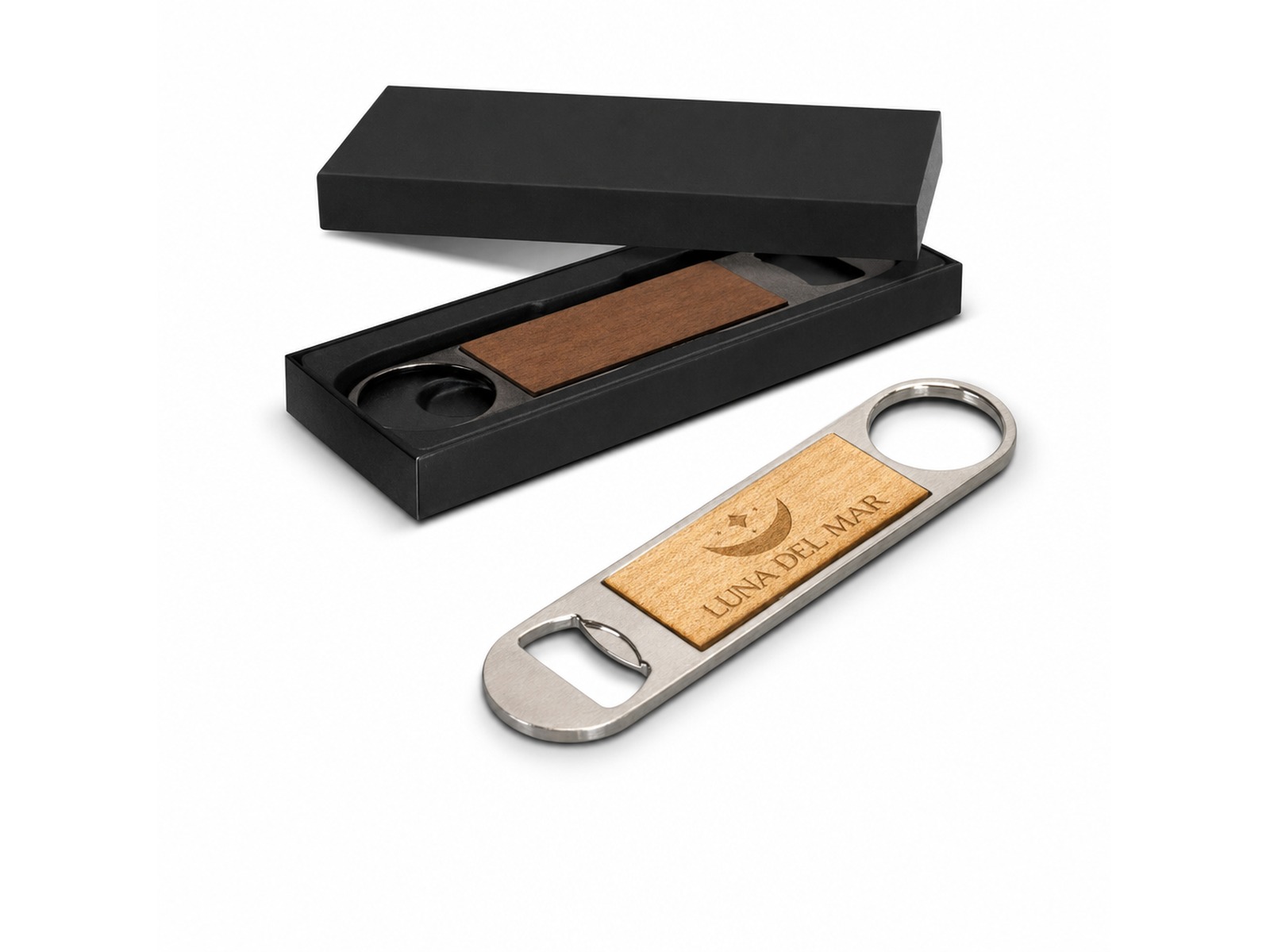 Introducing a stylish and functional bottle opener that combines aesthetics with practicality. This bottle opener features a metal bar blade for effortless opening and a wooden front, adding a touch of elegance to its design. The back of the opener is equipped with a magnet, allowing you to conveniently store it on your refrigerator or any other metal surface. Presented in an individual black box, it makes for an ideal gift or a sleek addition to your own barware collection. Enhance your beverage experience with this versatile and eye-catching bottle opener.