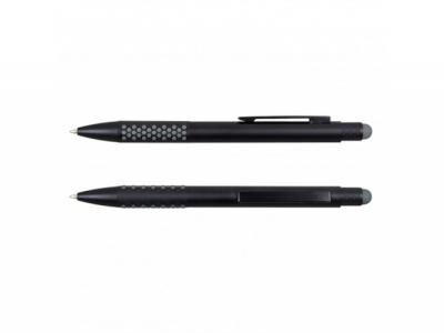 This branded pen and stylus combination offers versatility and convenience. It features a retractable aluminium ballpoint pen with a stylus tip, allowing you to easily switch between writing on paper and navigating touchscreen devices. The custom pen is designed with a lacquered matte black barrel and a unique PU frosted coloured grip, providing a comfortable writing experience. It is filled with 1200 meters of blue German-manufactured Dokumental ink, ensuring smooth and reliable performance. This pen and stylus combo is a practical tool for everyday use.