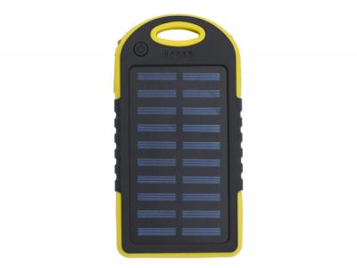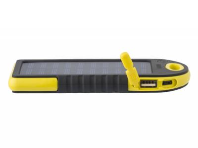 A solar power bank constructed from rubberized ABS material, featuring green indicator lights and a side-mounted flashlight. It is equipped with two USB ports and one micro USB port. The solar charging capability is rated at 5V/200mA, while the input is DC 5V/1A, and the output is DC 5V/2x1A. The power bank has a capacity of 4,000 mAh and comes with a USB cable included.