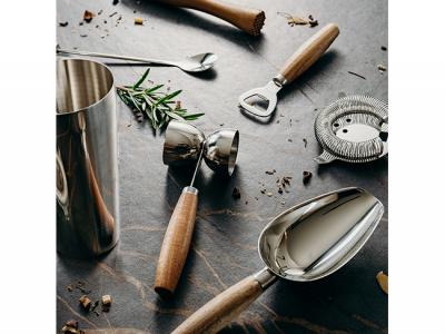 An exquisite eight-piece cocktail gift set, meticulously crafted from natural acacia wood and food-grade stainless steel. This set encompasses essential tools such as an ice scoop, strainer, shot measure, corkscrew, bottle opener, mixing spoon, muddler, and a stainless steel shaker. The elegance of this gift set is showcased in its presentation within a natural gift box adorned with a Keepsake branded sleeve.