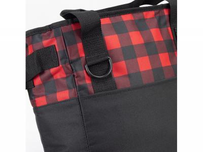 A spacious 19L promotional cooler bag, constructed from durable 600D polyester featuring an attractive checkered design. The main compartment, secured with a zipper, is insulated using PE foam, enclosed within a water-resistant PEVA lining. This bag comes with woven carry handles, a convenient bottle opener attachment, an adjustable shoulder strap, and a practical slip pocket.