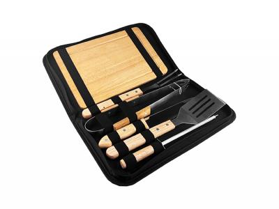 Custom Portable BBQ tool sets crafted from solid stainless steel and featuring resilient rubber wood handles painted with a natural finish, this stylish set is both durable and elegant. It comes neatly packed in a convenient black zip-up bag with a sturdy webbing handle for easy transport.