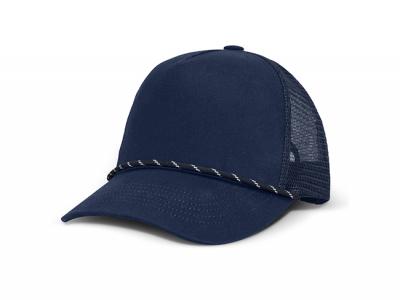 Our structured five-panel custom caps, crafted from 100% cotton twill with a breathable mesh back in a classic trucker style. Complete with a curved peak, matching button, and decorative cord detailing, this cap offers both style and functionality. Additional features include a sweatband for comfort and an adjustable snap back closure, ensuring a perfect fit for most wearers.