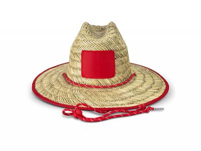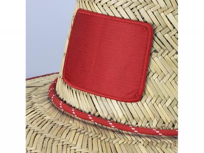 Experience timeless summer style with our classic wide-brim straw hat adorned with a coloured trim. Perfect for hot months, this breathable custom hat boasts a large woven polyester patch, offering an affordable and eye-catching branding platform. Complete with an adjustable chin strap featuring a toggle and metal aglets. and available in three sizes for universal wear.