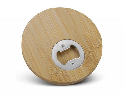 Upgrade your coaster game with our eco-friendly bamboo round coasters. Each coaster boasts a sleek bamboo surface and features a convenient built-in iron bottle opener underneath.