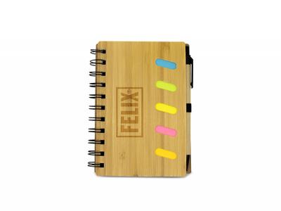 Maximize your productivity with our must-have trio custom notebooks. A spiral-bound custom notebook featuring a durable bamboo cover, a reliable click-action pen with black ink, and five sets of dynamic-coloured sticky notes. The bamboo cover not only ensures durability but also brings natural antimicrobial benefits to your workspace. With 60 lined pages for your thoughts and 75 sticky notes for quick memos, this powerhouse combination is designed to keep you on track and organized.