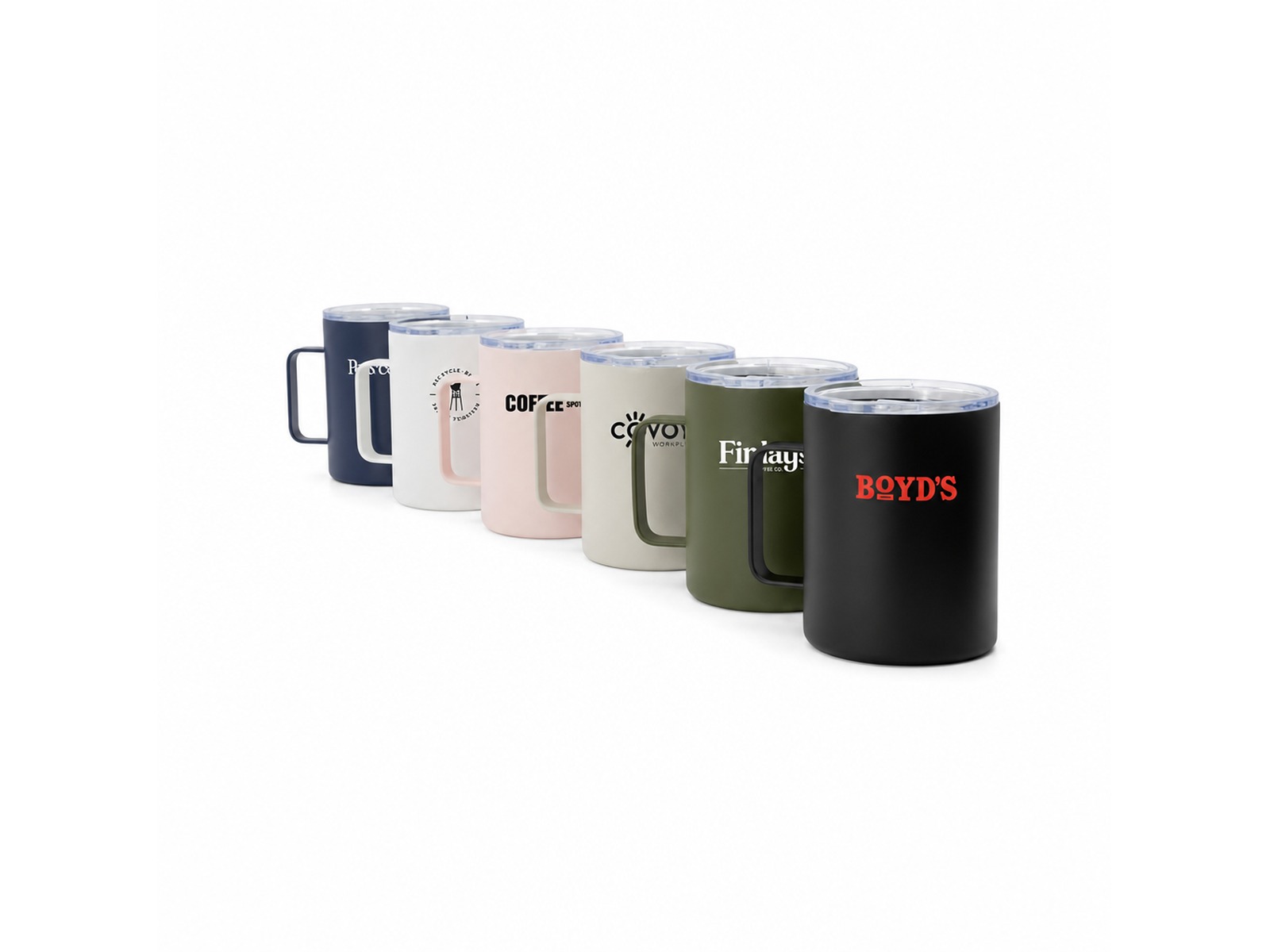 Custom brand these ceramic reusable coffee cups (350ml) or one of our best-selling promotional mugs»travel mugs with your company logo!