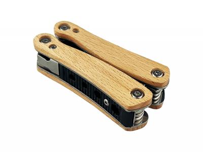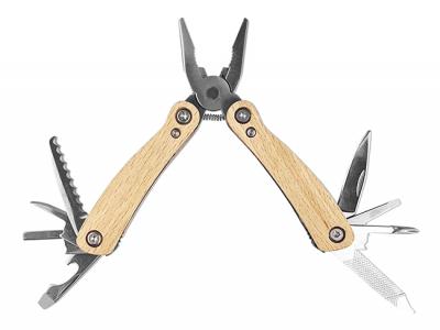 Introducing our compact 420 stainless steel multitool with elegant Beechwood handles, designed to provide versatility and convenience in a sleek, portable design. This robust multitool boasts thirteen essential functions: long nose pliers, standard pliers, wire cutters, serrated blade, bottle opener, large flat screwdriver, Philips head screwdriver, knife, saw, small flat screwdriver, can opener, medium flat screwdriver and a file, making it an indispensable companion for various tasks.