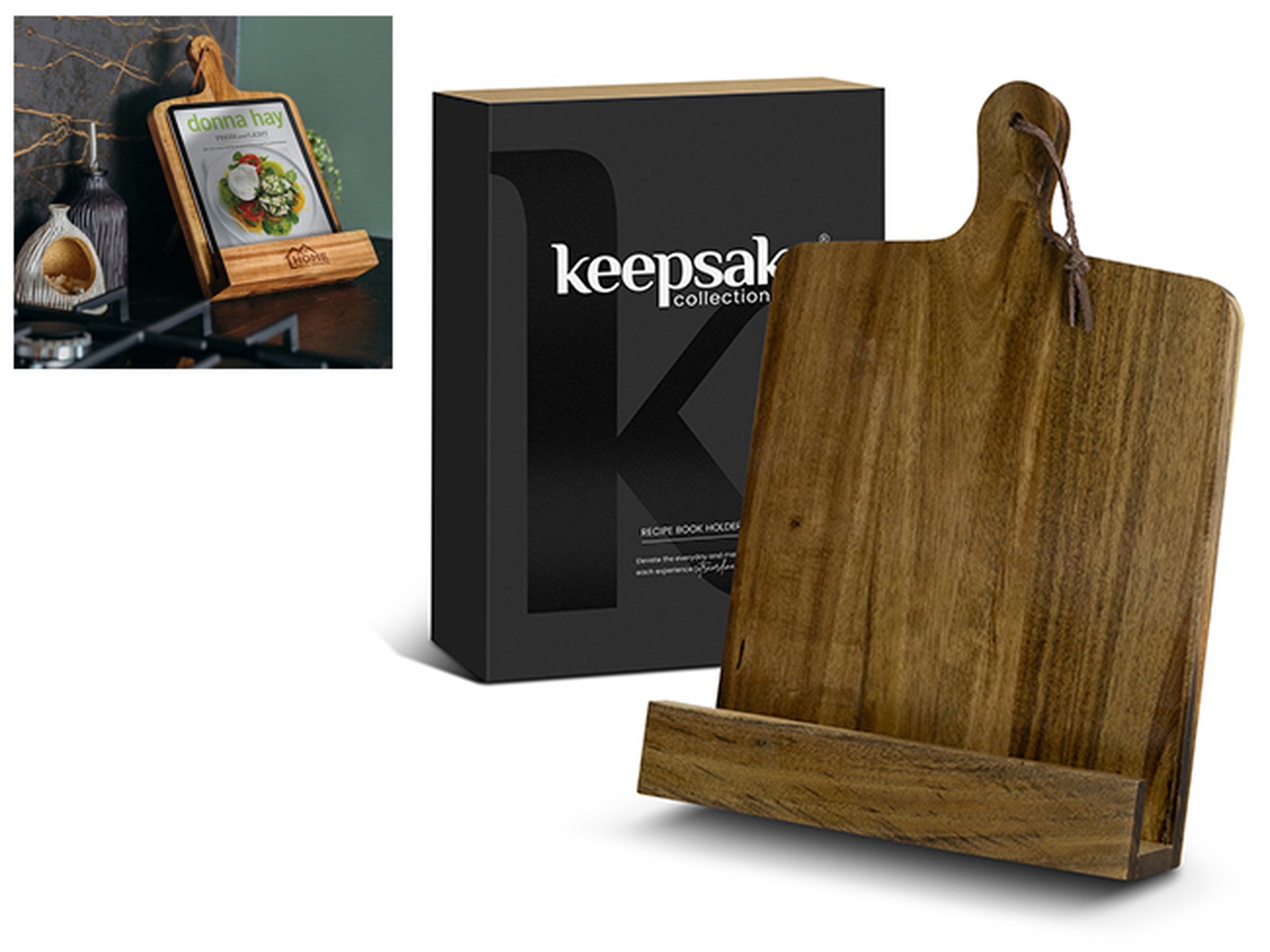 Upgrade your kitchen decor with this stylish wooden recipe book holder, meticulously crafted from 100% Acacia wood. Its elegant design is generously sized to accommodate a variety of recipe books, ensuring your favorite culinary guides are always within easy reach. Beyond traditional cookbooks, this versatile stand also provides sturdy support for digital devices, making it perfect for accessing online recipes. Presented in a natural gift box with a Keepsake branded sleeve, this refined book holder is a thoughtful gift for culinary enthusiasts and a sophisticated addition to any kitchen.
