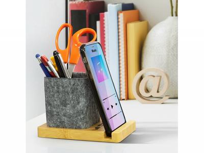 Keep your workspace tidy and stylish with our custom bamboo phone stand desk caddy! This eco-friendly desk accessory is perfect for holding your phone, pens, paper clips, and more. Made from GRS certified recycled felt on a natural bamboo base, it’s a practical and sustainable choice for offices, schools, and home desks. The stand supports phones in both horizontal and vertical positions, making it ideal for video calls, streaming, or just keeping your device handy. Presented in a natural kraft gift box, it’s a thoughtful gift for staff, clients, or event attendees.