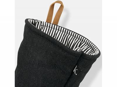 The Keepsake Canvas Oven Mitt is crafted from durable 300gsm cotton canvas with a washed black outer and a chic black-and-white striped lining. It features a convenient brown PU hanging loop and a small woven Keepsake label for a refined finish. Each mitt comes with a Keepsake branded hangtag, making it a standout choice for hospitality, events, or kitchen gifts.