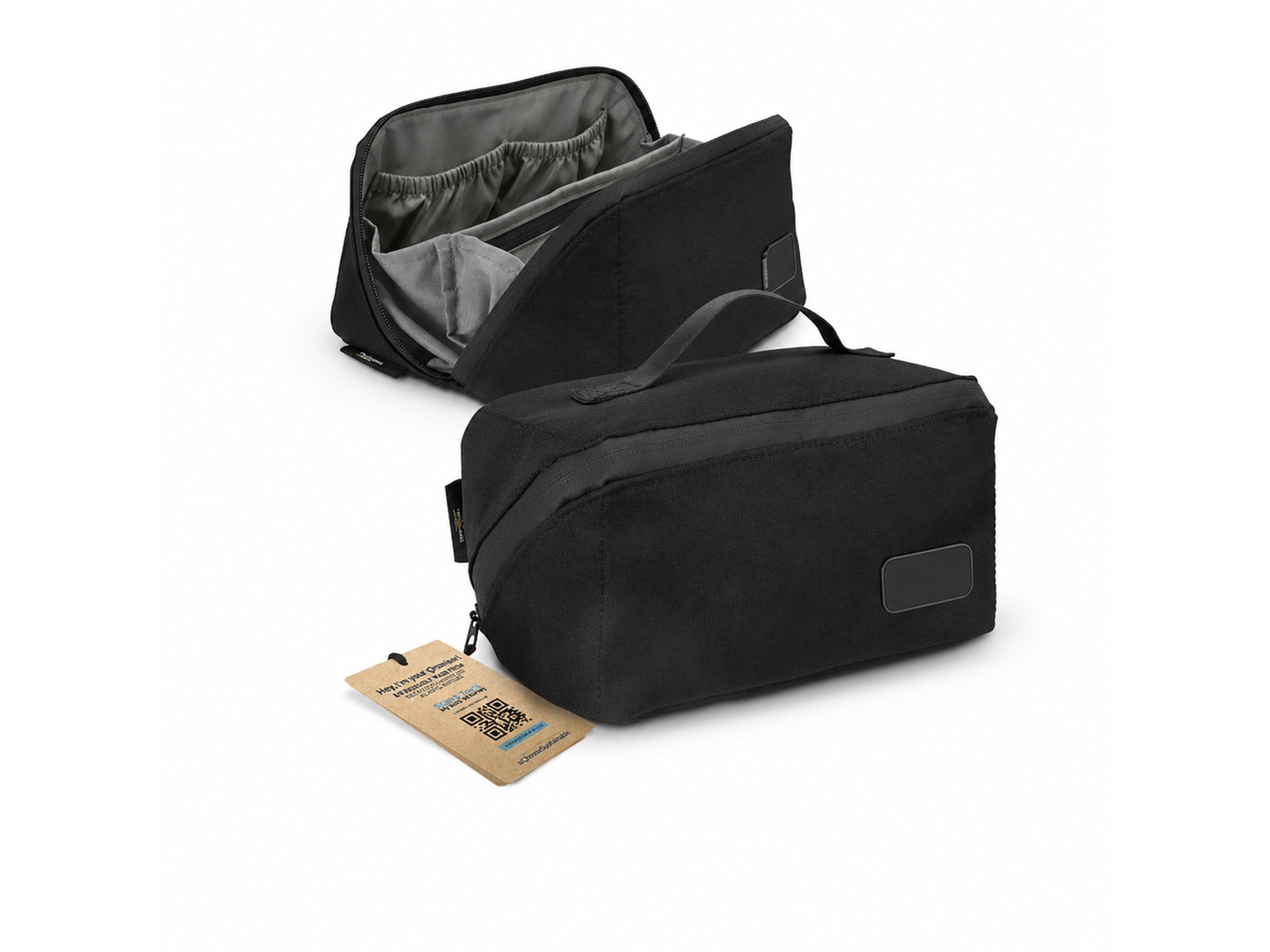 This branded toiletry bag is made from recovered ocean plastics and recycled RPET—perfect for travel, events, or as a thoughtful gift for staff, clients, or eco-conscious customers. Personalise with your logo for conferences, hospitality, or wellness promotions.